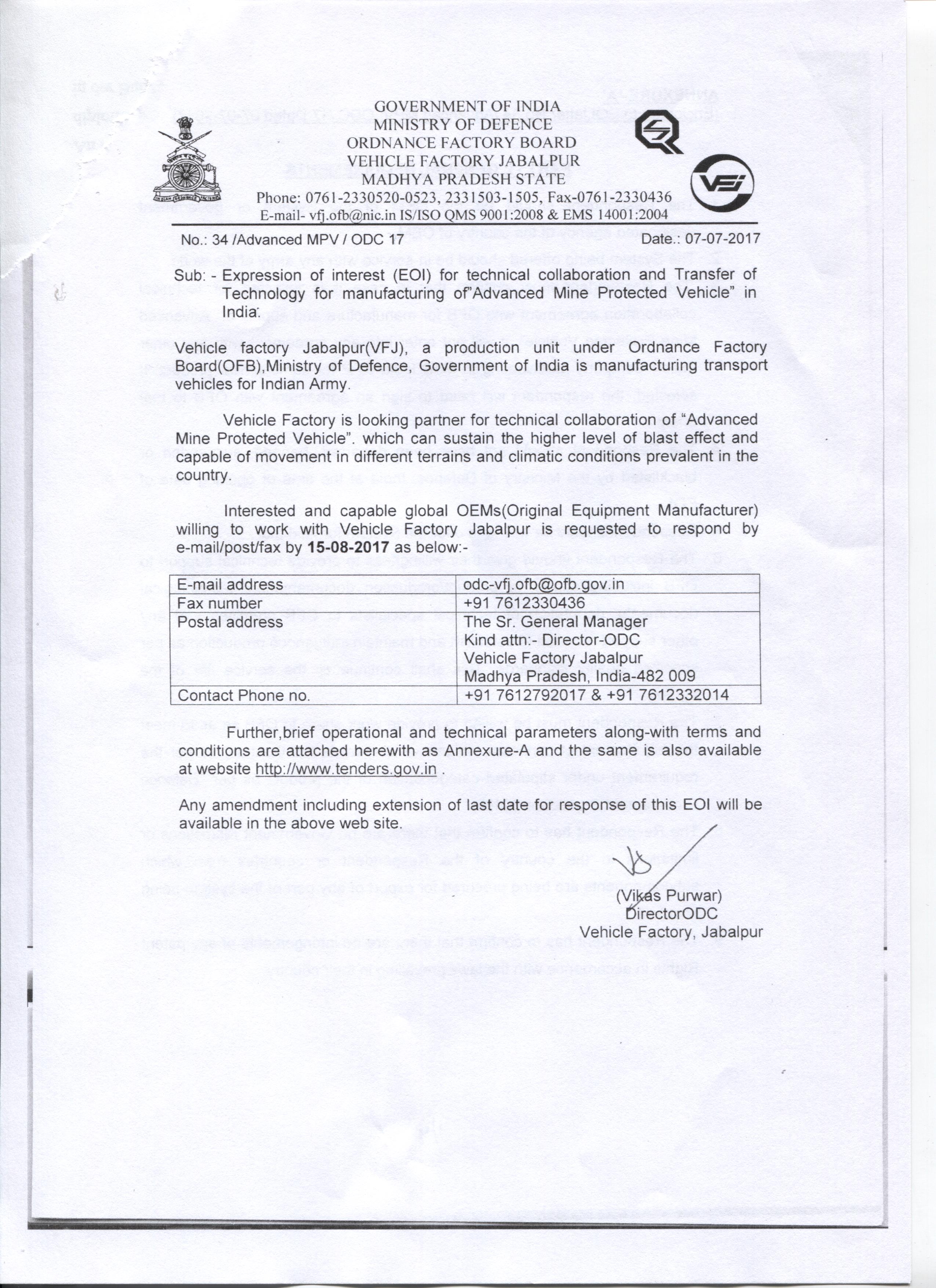 • Vehicle factory Jabalpur: Advanced Mine Protected Vehicle