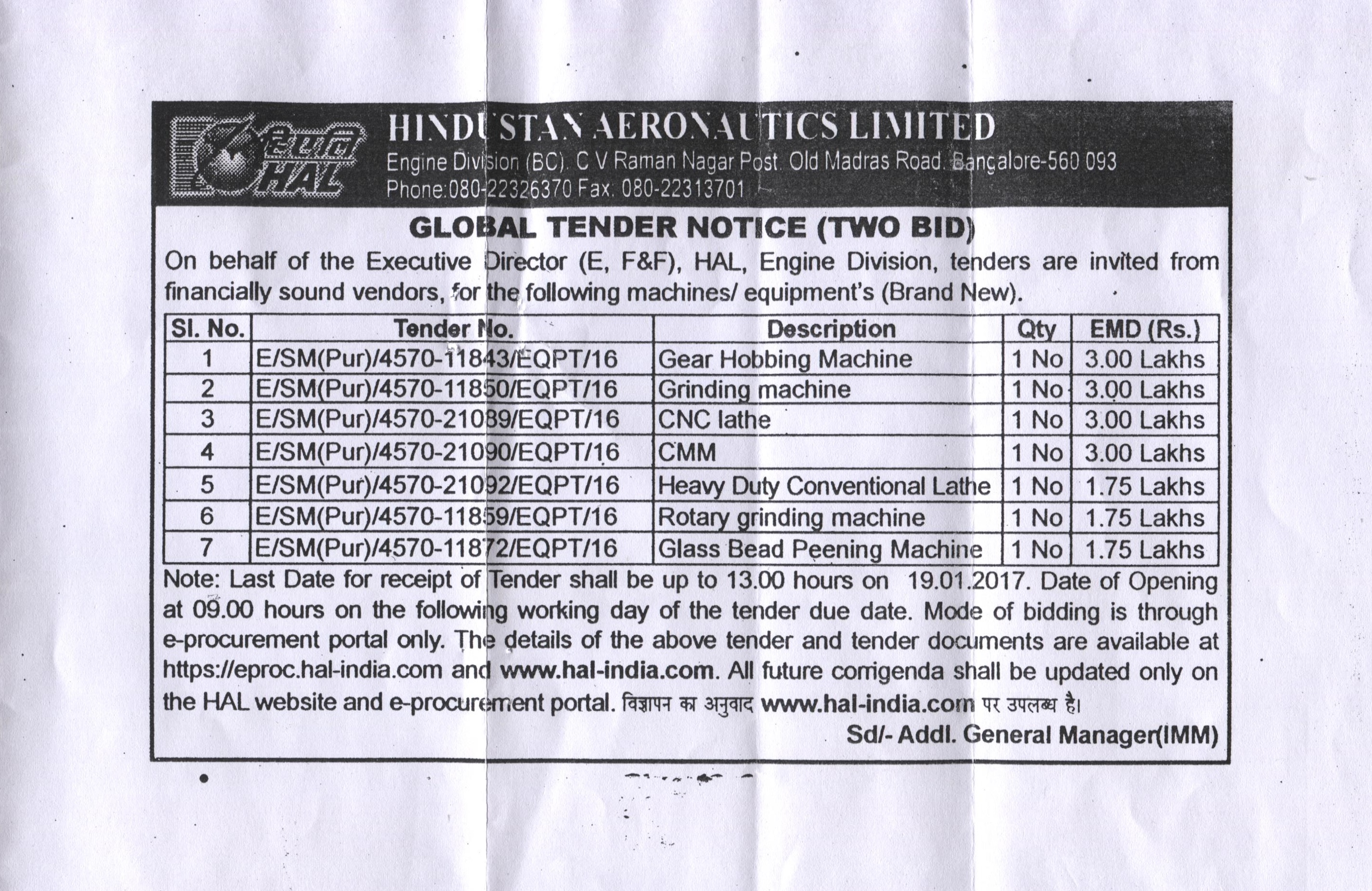 • Tender notices by Hindustan Aeronautics Limited