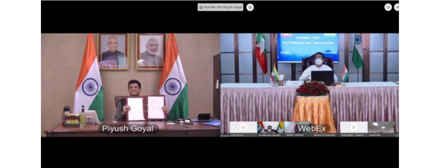 7th India Myanmar Joint Trade Committee meeting was held on 24 November, 2020. It was co-chaired by H.E. Shri Piyush Goyal, Minister of Minister of Railways, Minister of Commerce and Industry and Minister of Consumer Affairs, Food and Public Distribution of India and H.E. Dr. U Than Myint, Myanmar's Union Minister of the Ministry of Commerce. During the meeting, both sides discussed the way forward to enhance bilateral cooperation in trade and investment.