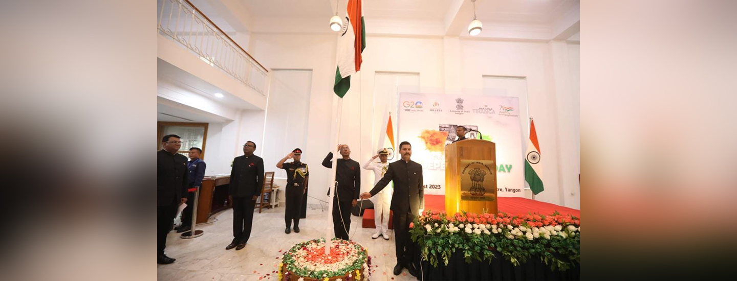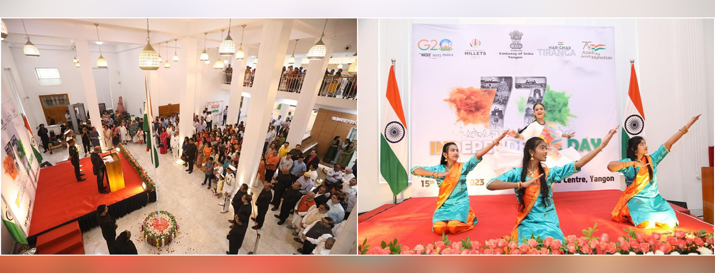 Embassy of India Yangon celebrated the 77th Independence Day today with enthusiastic participation of Indian nationals in Myanmar. H.E. Shri Vinay Kumar hoisted the national flag and read the President’s address to the nation. Cultural programs by artists from SVCC infused a spirit of patriotism in the audiences.(15 August, 2023)