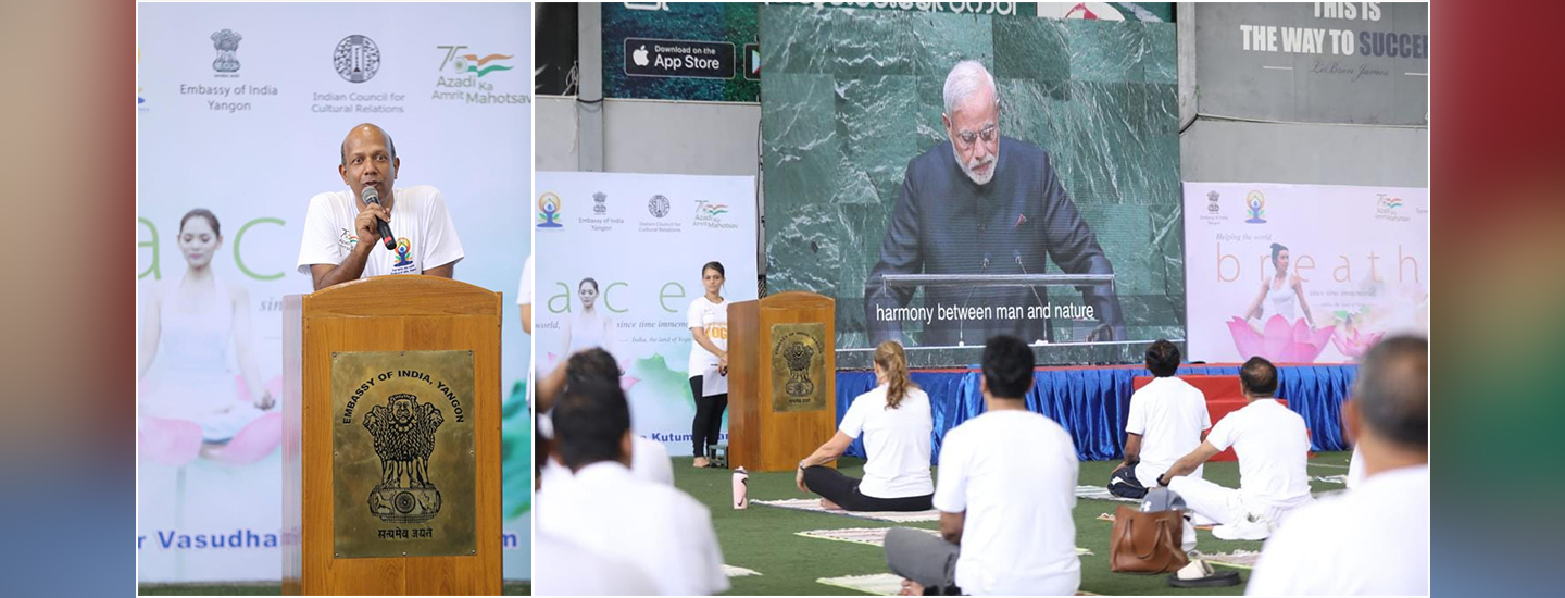 Celebration of 9th International Day of Yoga in Yangon with a mass Yoga demonstration at Yangon United Sports Complex on June 21, 2023.
