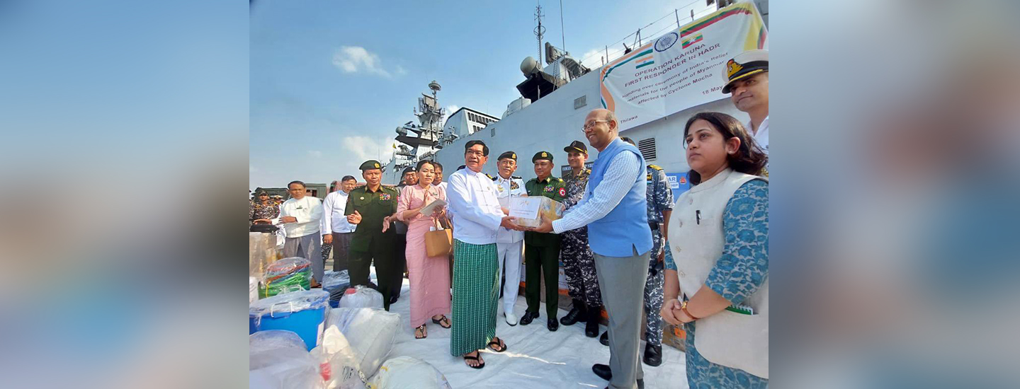 Ambassador Shri Vinay Kumar handed over humanitarian assistance and disaster relief (HADR) materials for people of Myanmar affected by #CycloneMocha to Yangon Region Chief Minister today under #OperationKaruna(18 May, 2023)