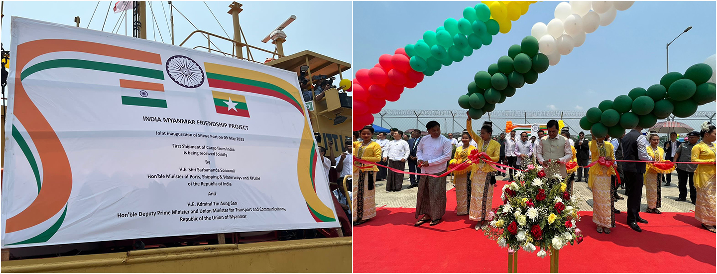 H.E. Shri Sarbananda Sonowal, Hon’ble Minister for Ports, Shipping and Waterways of the Republic of India and H.E. Admiral Tin Aung San, Deputy Prime Minister and Minister for Transport and Communications received the maiden cargo vessel ITT LION bringing construction material to Sittwe. (9 May 2023)