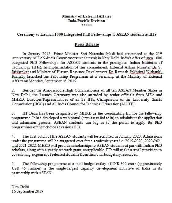India launched largest capacity-building programme in #ASEANIndia bullet partnership - offering 1000 fellowships to students from ASEAN to carry out doctoral research at #IITs. Interested applicants can visit the link below to register.