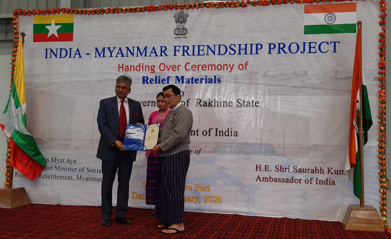 မြန်မာနိုင်ငံဆိုင်ရာ အိန္ဒိယနိုင်ငံသံအမတ်ကြီးသည် ရခိုင်ပြည်နယ်တွင်ဖြစ်ပွားလျက်ရှိသော ပဋိပက္ခများ၏ အကျိုးဆက်အဖြစ် နေရပ်စွန့်ခွာသူများအတွက် အိန္ဒိယနိုင်ငံ အစိုးရ၏ ကူညီထောက်ပံ့သည့် ပစ္စည်းများအား ရခိုင်ပြည်နယ်အစိုးရအဖွဲ့သို့လွှဲပြောင်းပေးအပ်ခဲ့ပါသည်။ ထိုသို့လွှဲပြောင်းပေးအပ်သည့်အခမ်းအနားအား ၂၀၂၀ ခုနှစ် ဇန်နဝါရီလ (၂၁) ရက်နေ့တွင် စစ်တွေမြို့၌ကျင်းပခဲ့ပြီး ထိုအခမ်းအနားသို့ လူမှုဝန်ထမ်း၊ ကယ်ဆယ်ရေး နှင့်ပြန်လည်နေရာချထားရေးဝန်ကြီးဌာန ပြည်ထောင်စုဝန်ကြီး ဒေါက်တာဝင်းမြတ်အေး၊ ရခိုင်ပြည်နယ်ဝန်ကြီးချုပ် ဦးညီပု၊ လူမှုဝန်ထမ်း၊ ကယ်ဆယ်ရေးနှင့်ပြန်လည်နေရာချထားရေးဝန်ကြီးဌာနဒုတိယဝန်ကြီး ဦးစိုးအောင် ၊ရခိုင်ပြည်နယ် လွှတ်တော်ဥက္ကဌ ဦးစံကျော်လှ နှင့် မြန်မာနိုင်ငံဆိုင်ရာ အိန္ဒိယနိုင်ငံသံအမတ်ကြီး ရှရီ ဆော်ရဘ် ကူးမား တို့တက်ရောက် ခဲ့ပါသည်။ ထိုကူညီထောက်ပံ့သည့်ပစ္စည်းများ၏တန်ဘိုးမှာ အမေရိကန်ဒေါ်လာ (၂၃၅၄၅၆) ဖြစ်ပြီး ဆန်၊ ဆန်ခေါက်ဆွဲ၊ Toor Dal, Chana Dal ပဲပုပ်ဆီ၊ ငရုတ်သီးမှုန့်၊ နနွင်းမှုန့်၊ နံနံပင်မှုန့်၊ ကူမင်းမှုန့်၊ ဆားနှင့် တာပေါ်လင်စများစသည့် ပစ္စည်းအမျိုးအစားများပါဝင်သည့် အထုပ်ပေါင်း (၂၀၀၀၀) ဖြစ်ပါသည်။