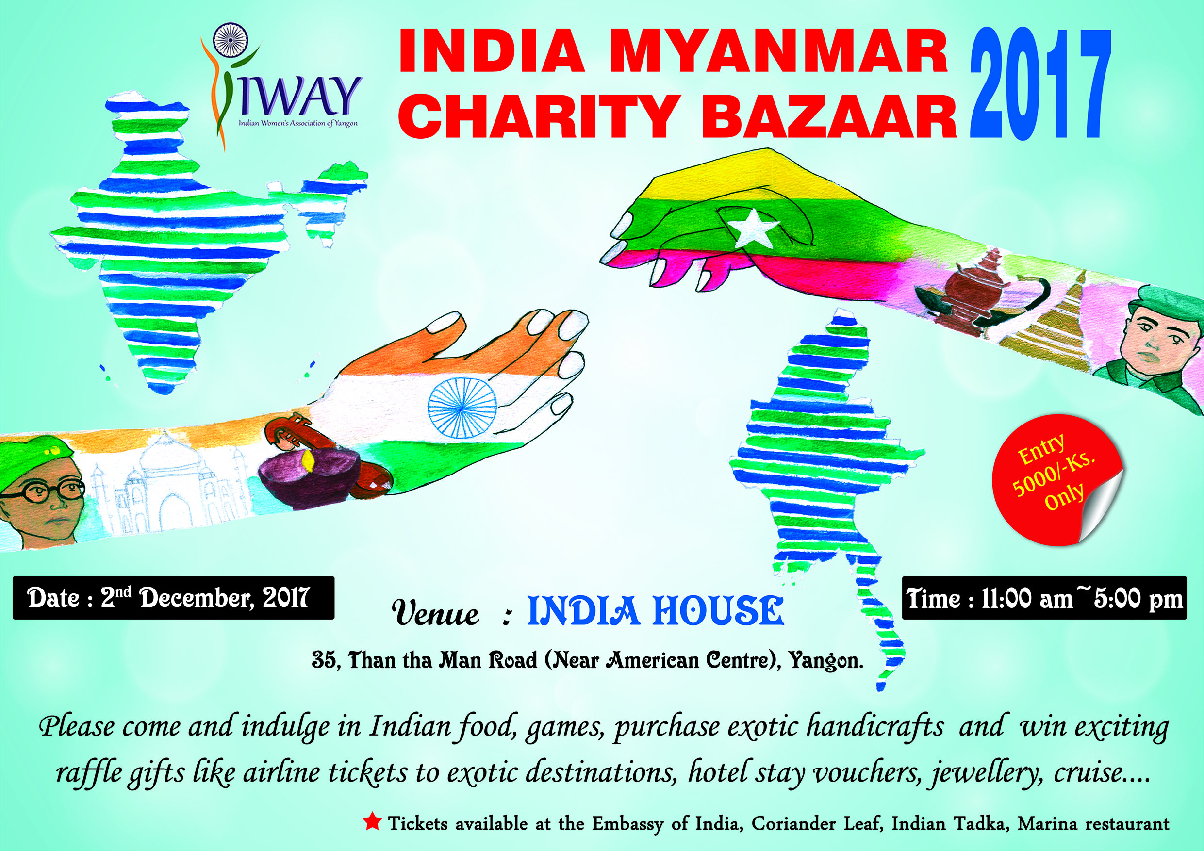 Indian Women’s Association of Yangon (IWAY) will be organizing ​the “INDIA – MYANMAR CHARITY BAZAAR 2017" at Indian House, No.35, Than Ta Man Road (Near American Centre, Yangon), Dagon Township, Yangon on 2nd December, 2017 (Saturday) from 11:00 am to 5:00 pm.