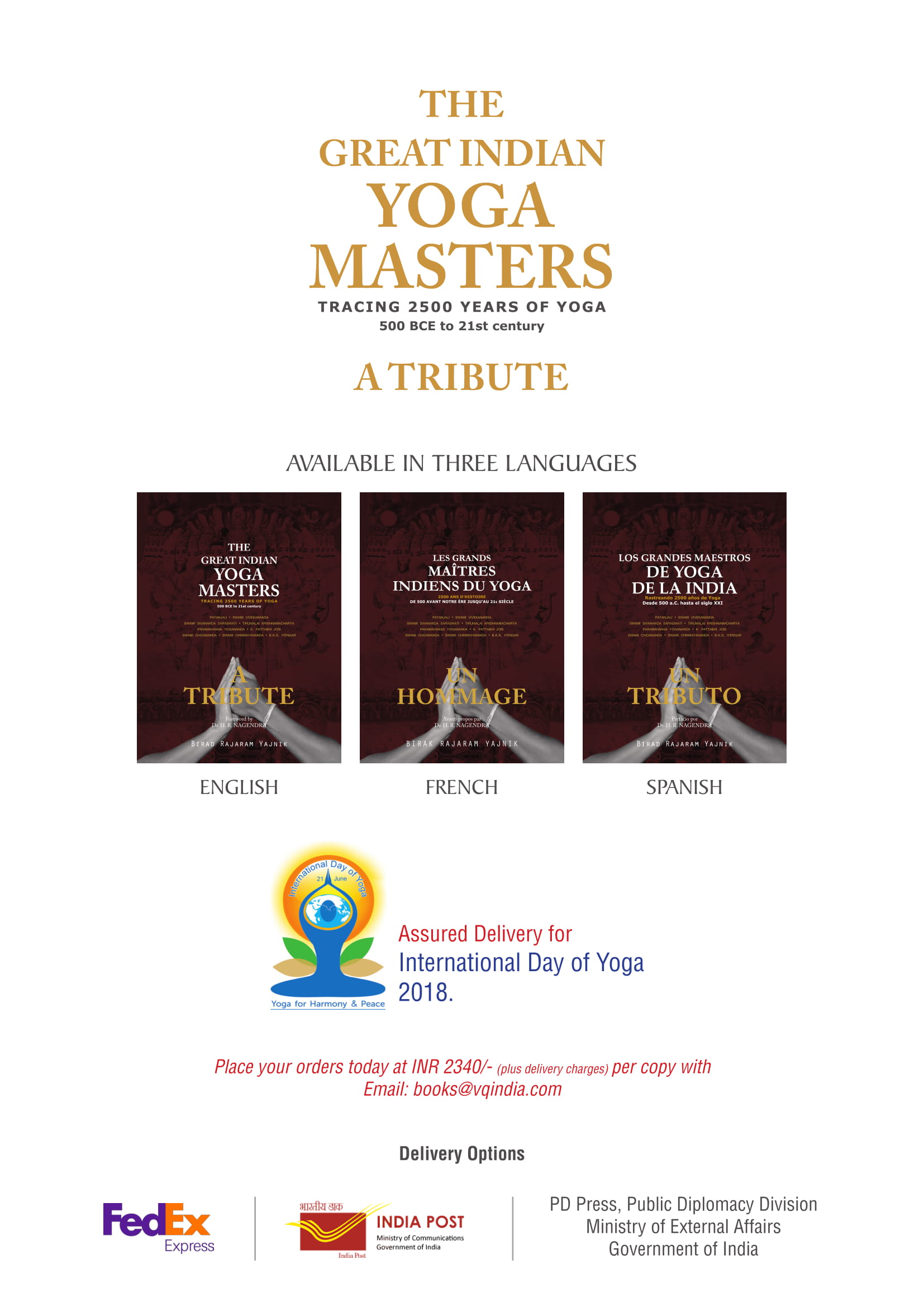 For the run up to International Day of Yoga 2018, the Coffee Table Book "The Great Indian Yoga Masters – A Tribute" is now available in English,Spanish and French languages and can be ordered directly by writing to Visual Quest Books at INR 2340/- (plus delivery charges) per copy with Email: books@vqindia.com