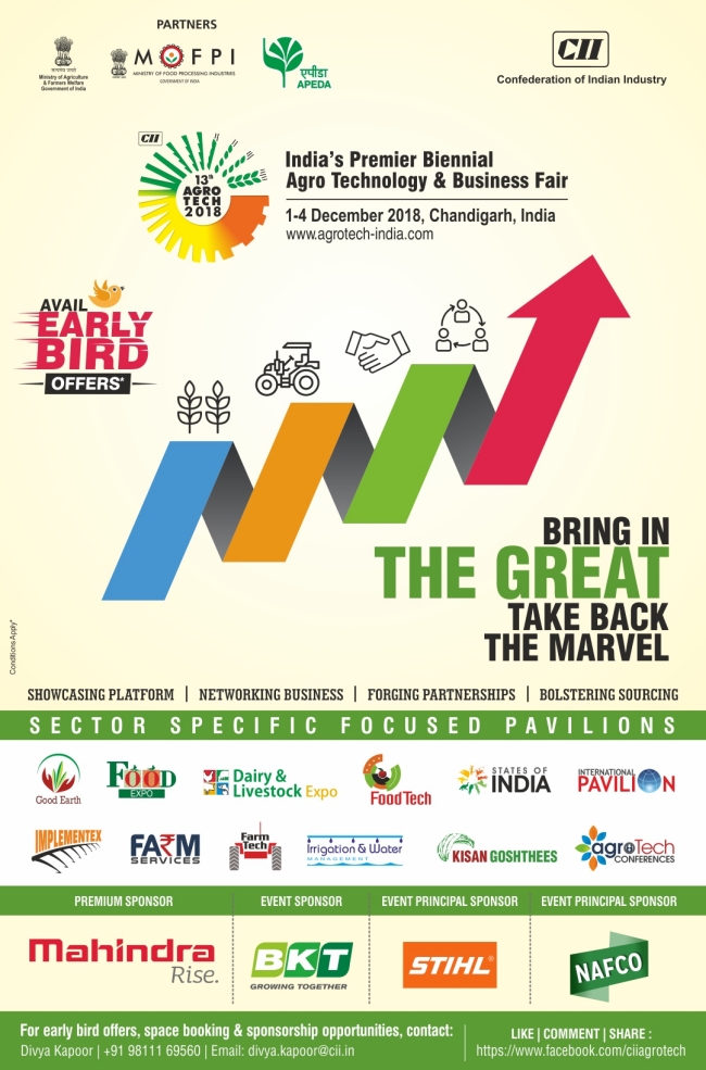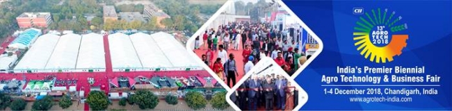 Confederation of Indian Industry (CII) is organizing the 13th edition of Agro Tech from 1– 4 December 2018 in Chandigarh (Capital of Punjab and Haryana – two leading states in agriculture and food processing sector), India.