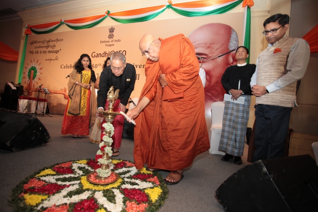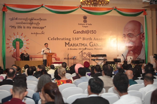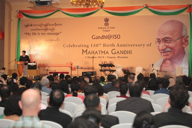 မဟတၱမဂႏီၶ၏ ႏွစ္(၁၅၀)ျပည္႔ ေမြးေန႔အထိမ္းအမွတ္ (၂)ႏွစ္တာကာလအတြင္း အခမ္းအနားမ်ားက်င္းပျခင္းအား ဆူးေလ႐ွန္ဂရီလာဟိုတယ္၌ ၂၀၁၈ခုႏွစ္ ေအာက္တုိဘာလ (၂)ရက္ေန႔တြင္ အိႏိၵယသံရံုး၊ ရန္ကုန္ျမိဳ႕မွ စီစဥ္က်င္းပခဲ့ပါ သည္။