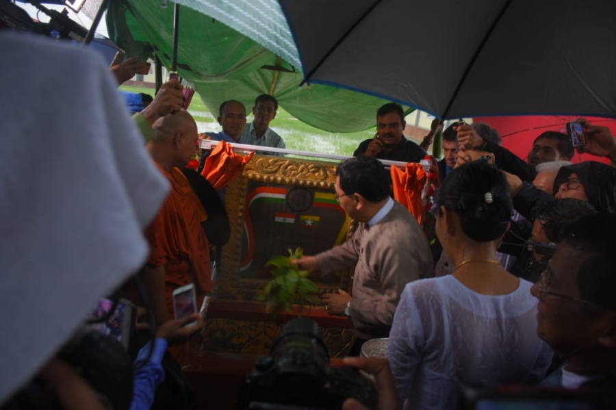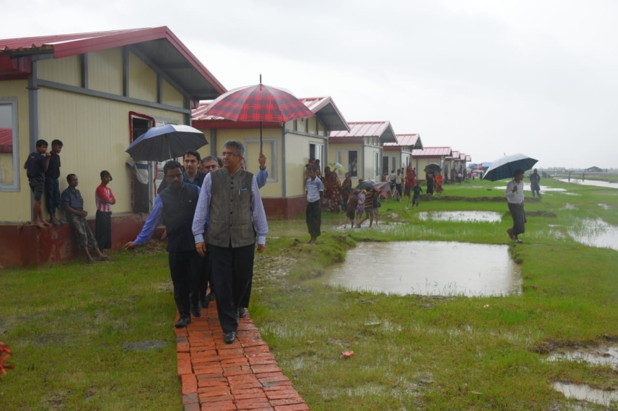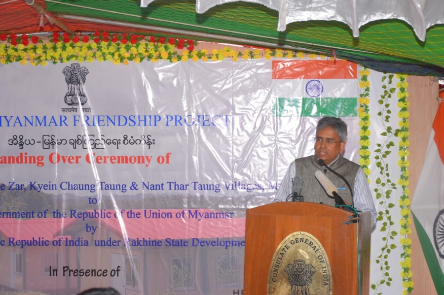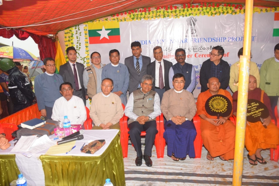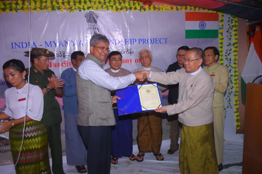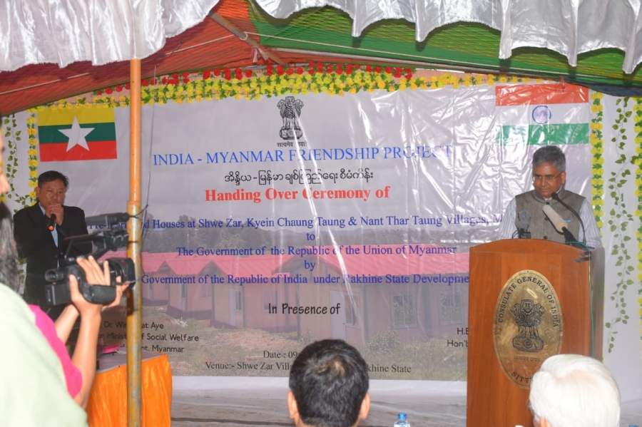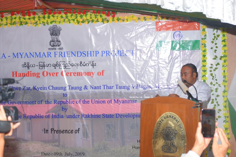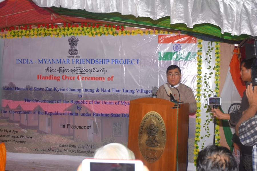 1. In a handing over ceremony at Maung Daw, Rakhine State on 9 July 2019, the Ambassador of India Saurabh Kumar handed over the documents related to 250 pre-fabricated houses for use of displaced returnees from Bangladesh, to U Aung Kyaw Zan, Joint-chairman of Returnee Resettlement Work Committee and the Minister for Electricity, Industry and Transportation of Rakhine State Government. The latter presented a Letter of Acknowledgement to the Ambassador. The Union Minister for Social Welfare, Relief and Resettlement, Dr. Win Myat Aye was present on the occasion. In his remarks Dr. Win Myat Aye thanked the Government of India for its assistance and recalled the growing bilateral ties between the two countries.