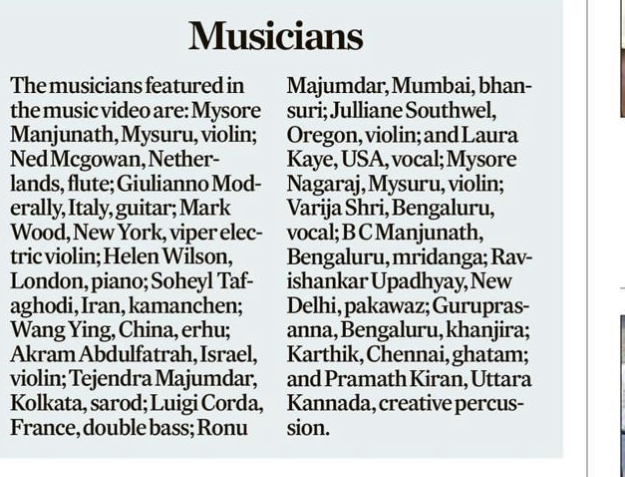 အိန္ဒိယနိုင်ငံယဉ်ကျေးမှုဆိုင်ရာဆက်ဆံရေးကောင်စီသည် COVID-19 ကာလအတွင်း စည်းလုံးညီညွတ်မှု၏ အင်အားတစ်ရပ်အဖြစ် နိုင်ငံတကာရှိ ထင်ပေါ်ကျော်ကြားသောဂီတအနုပညာရှင် (၂၀) ဦးနှင့် အိန္ဒိယမှဂီတအနုပညာရှင်များ၏ပူးပေါင်းဆောင်ရွက်မှုဖြင့် ဤသီချင်းကို မိတ်ဆက်ခဲ့ပါသည်။ ဤထူးခြားသောဂုဏ်ပြုသည့်တေးဂီတကို ထင်ရှားကျော်ကြားသောတယောပညာရှင်ဒေါက်တာ Mysore Manjunath မှရှေးဟောင်းအိန္ဒိယ Raga Charukeshi ဂီတအမျိုးအစားနှင့်ရေးစပ်ထားသည်။ ဂီတပညာရှင်အားလုံးသည် သက်ဆိုင်ရာနို်ငငံအသီးသီးဖြစ်သော Italy, the UK, the US, Iran, China, Middle East, France တို့တွင်တီးခတ်ပြီ အသံသွင်းထားကြခြင်းဖြစ်သည်။