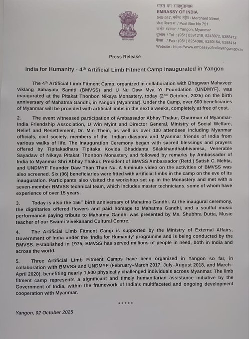 India for Humanity - 4th Artificial Limb Fitment Camp inaugurated in Yangon
